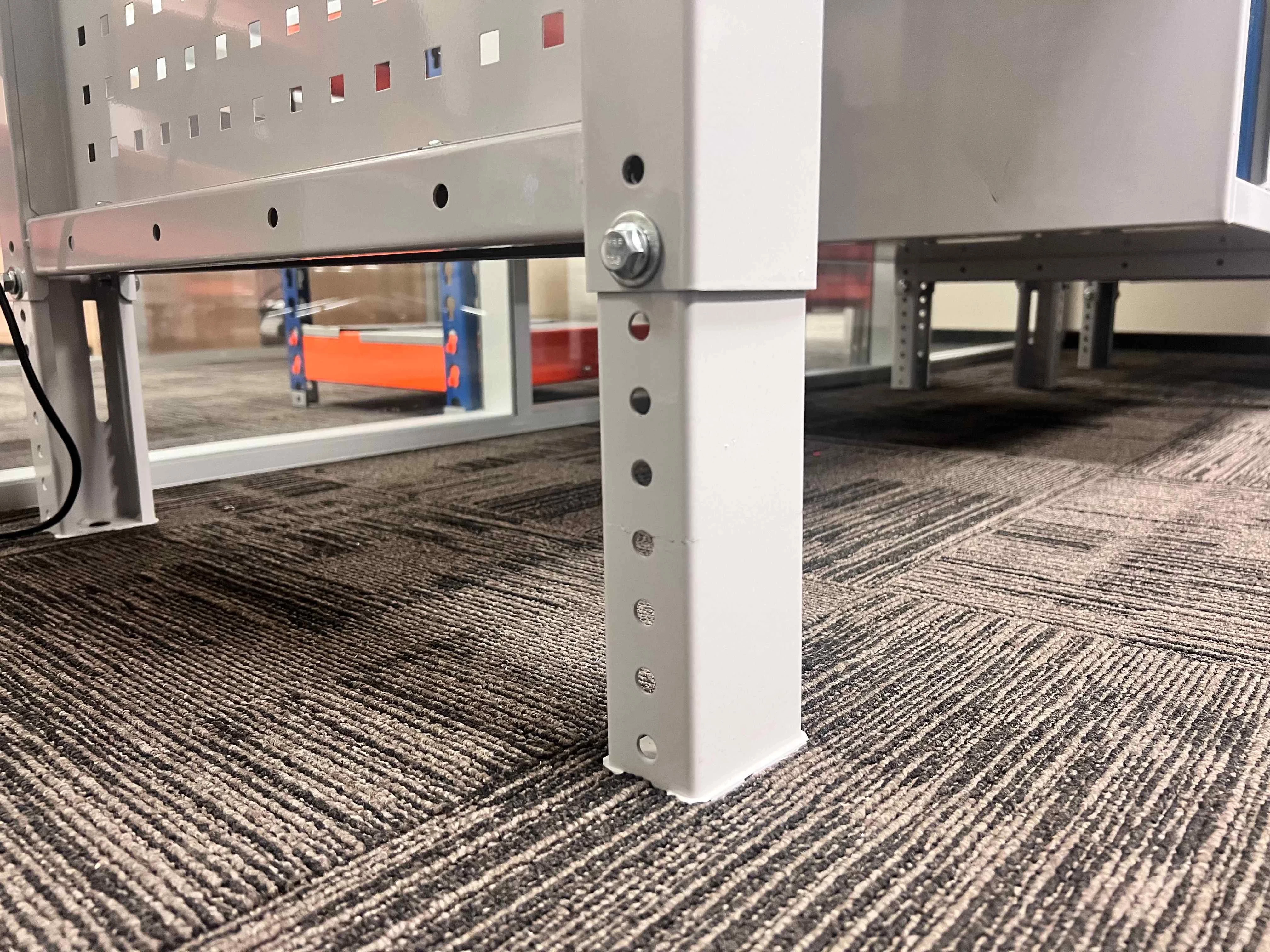 Благодаря наличию ножек высоту верстака можно варьировать от 0.7 метра до 0.95 метра (шаг – 25 мм), а также осуществлять более тонкую регулировку с помощью усиленных подпятников на резьбе.