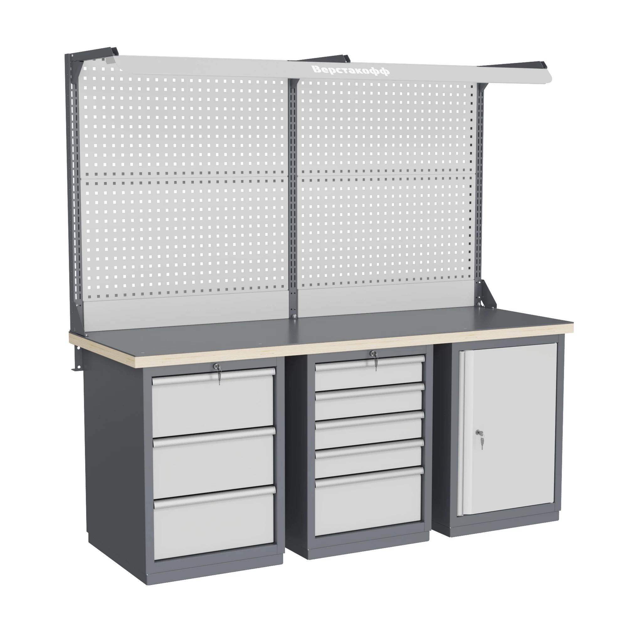 Рабочее место комплектуется двойным перфорированным экраном, на котором удобно размещать держатели для инструментов, полки и другие навесные элементы, благодаря чему весь необходимый инвентарь всегда будет на виду. Шаг перфорации — 38 мм. Максимальная нагрузка на панель — 150 кг.