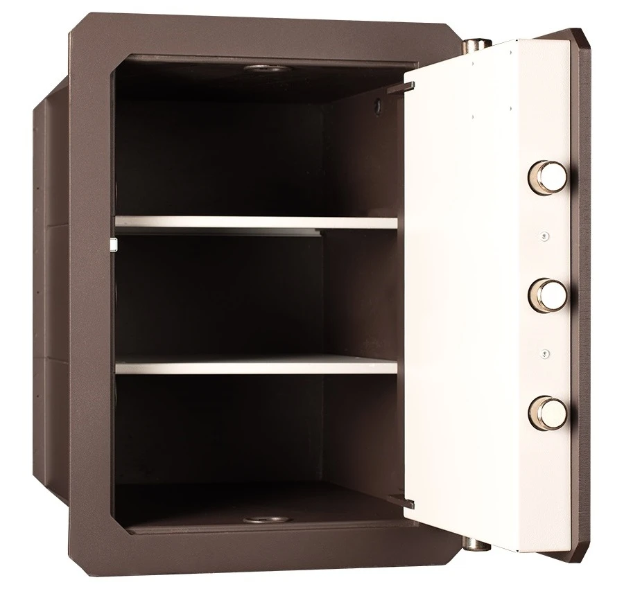 Для удобного и упорядоченного размещения ценностей предусмотрены две полочки, разделяющие внутреннее пространство на три уровня. При необходимости их можно снять и разместить предметы по всей полезной высоте сейфа.